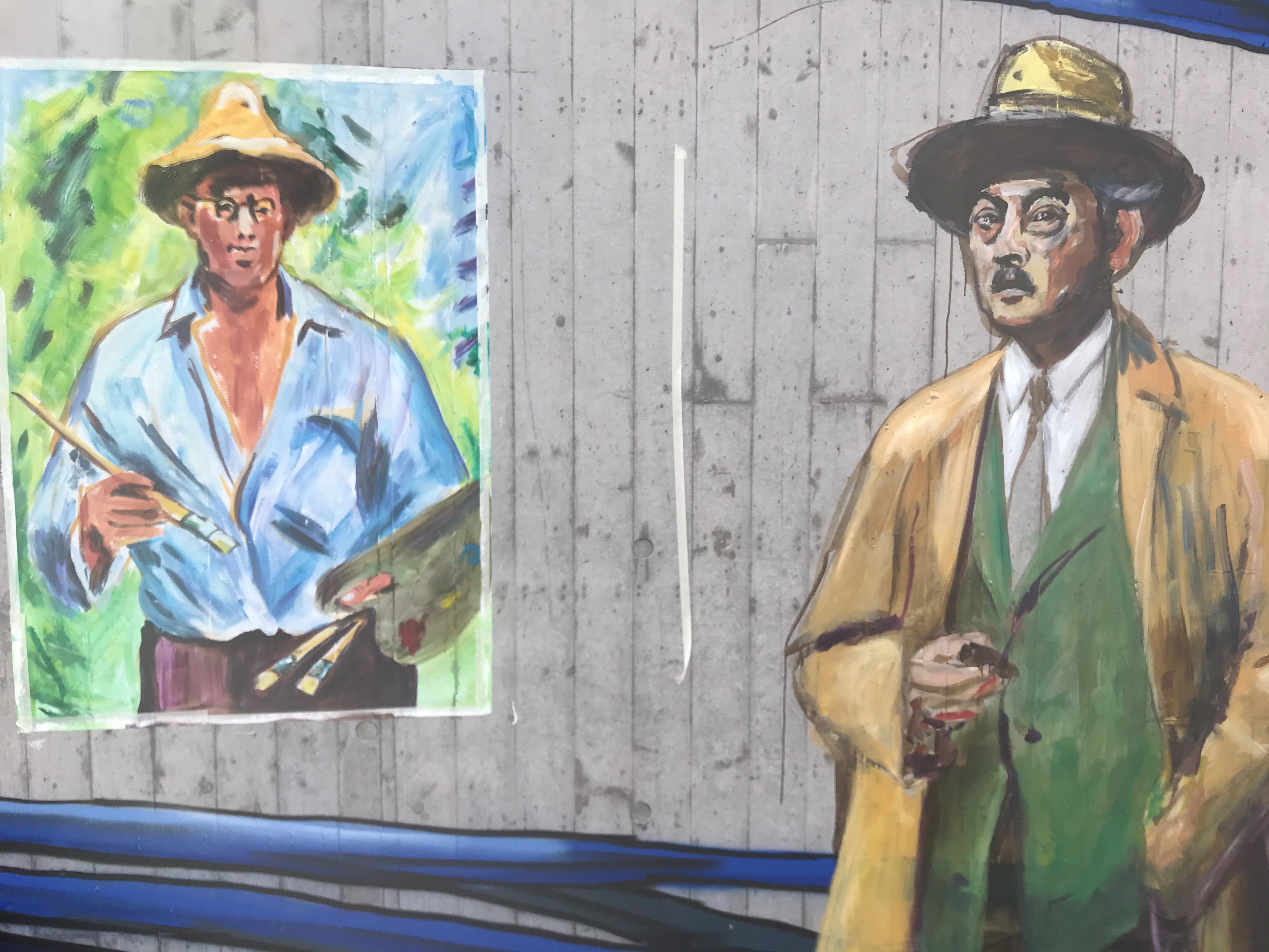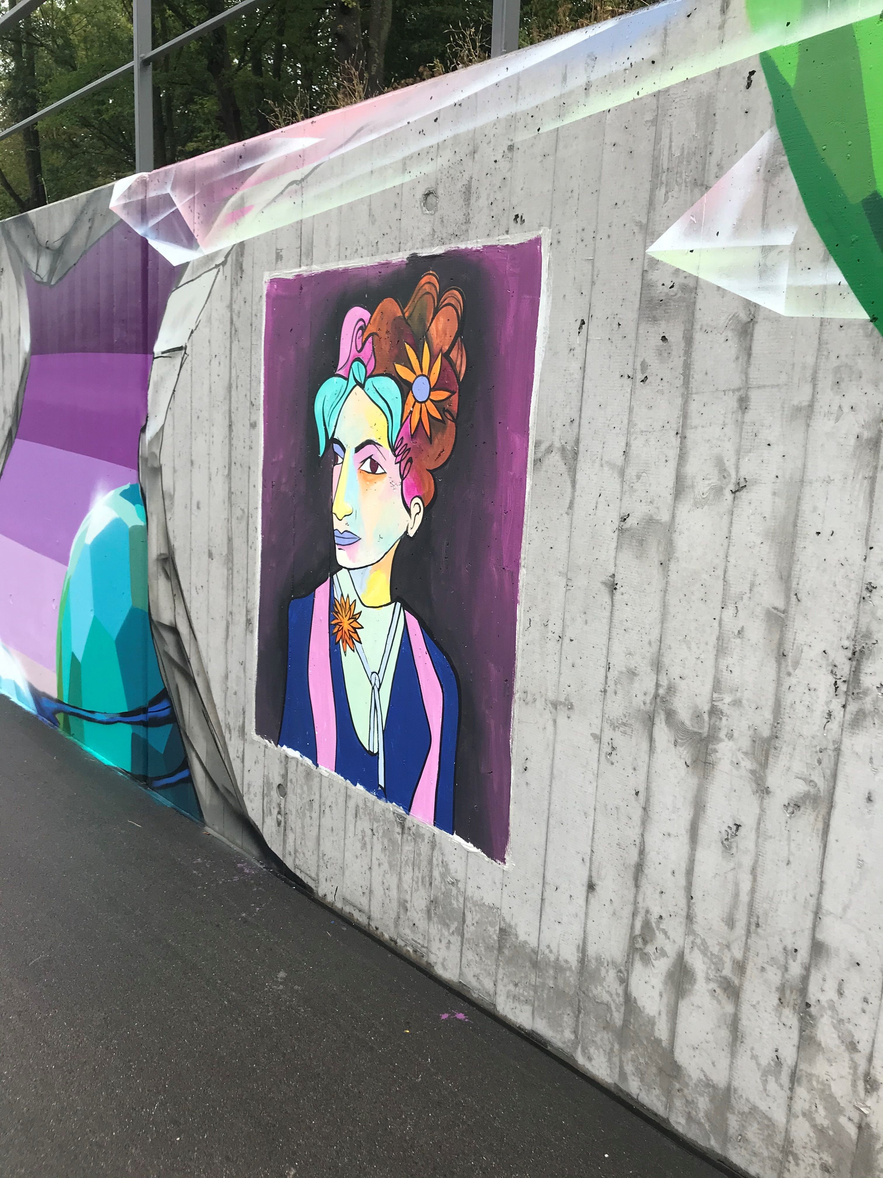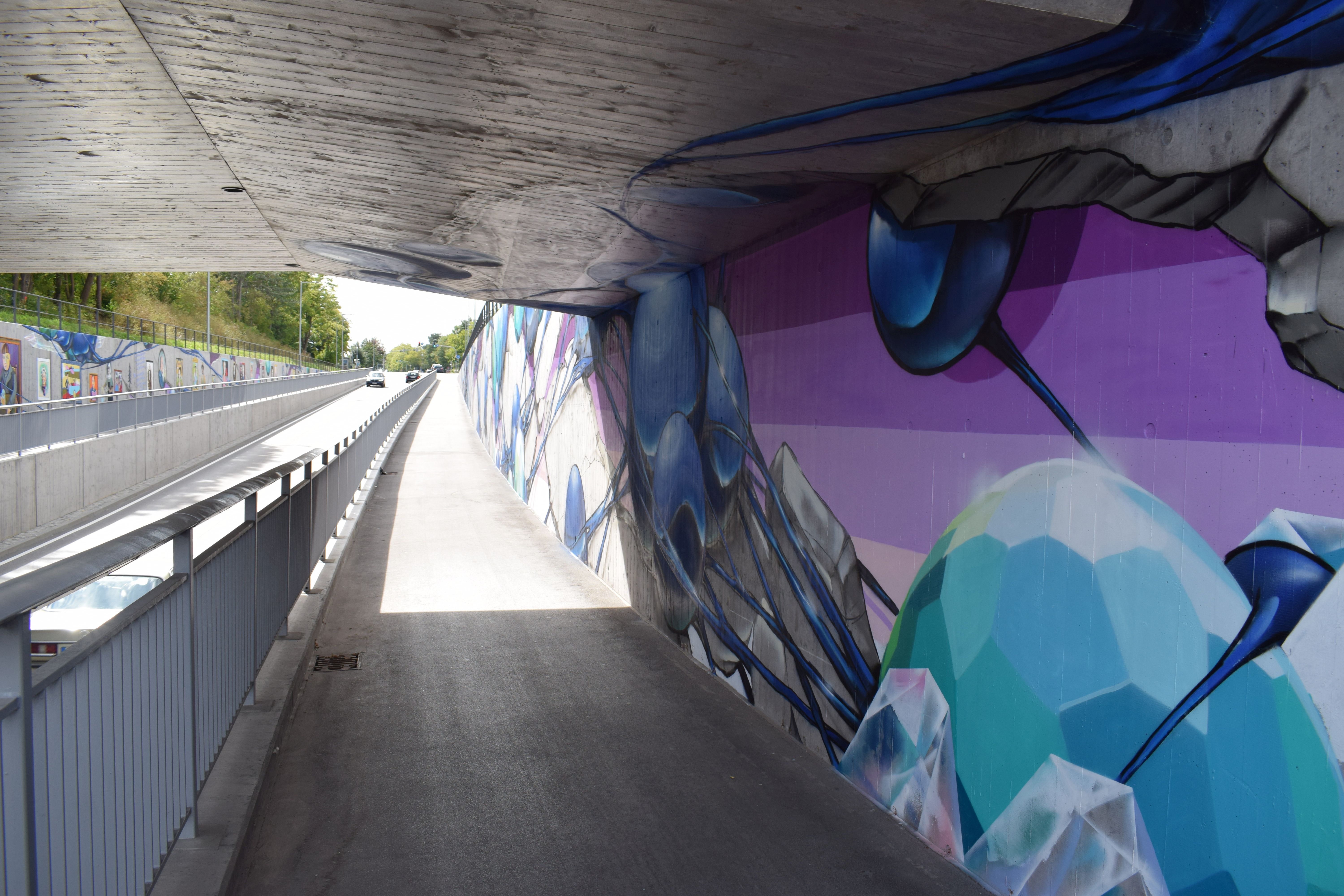 Von den in Berlin lebenden Wandmalenden Jim Avignon und Henrieke Ribbe ausgeführt, gehen die stilistisch überzeichneten und gleichzeitig lebensnah eingefangenen Antlitze in Art einer Gemäldegalerie in einen farben- und formenprächtigen Dialog mit den abstrahiert-verspielten, floral-kristallinen Bildfindungen des Stuttgarter Sprayers Jeroo, der für sein bisher größtes geschaffenes abstrakt-ornamentales Graffiti-Werk im Ausmaß von jeweils rund 230 Meter Länge pro Wand weit mehr als 300 Montana-Spraydosen verbraucht hat.