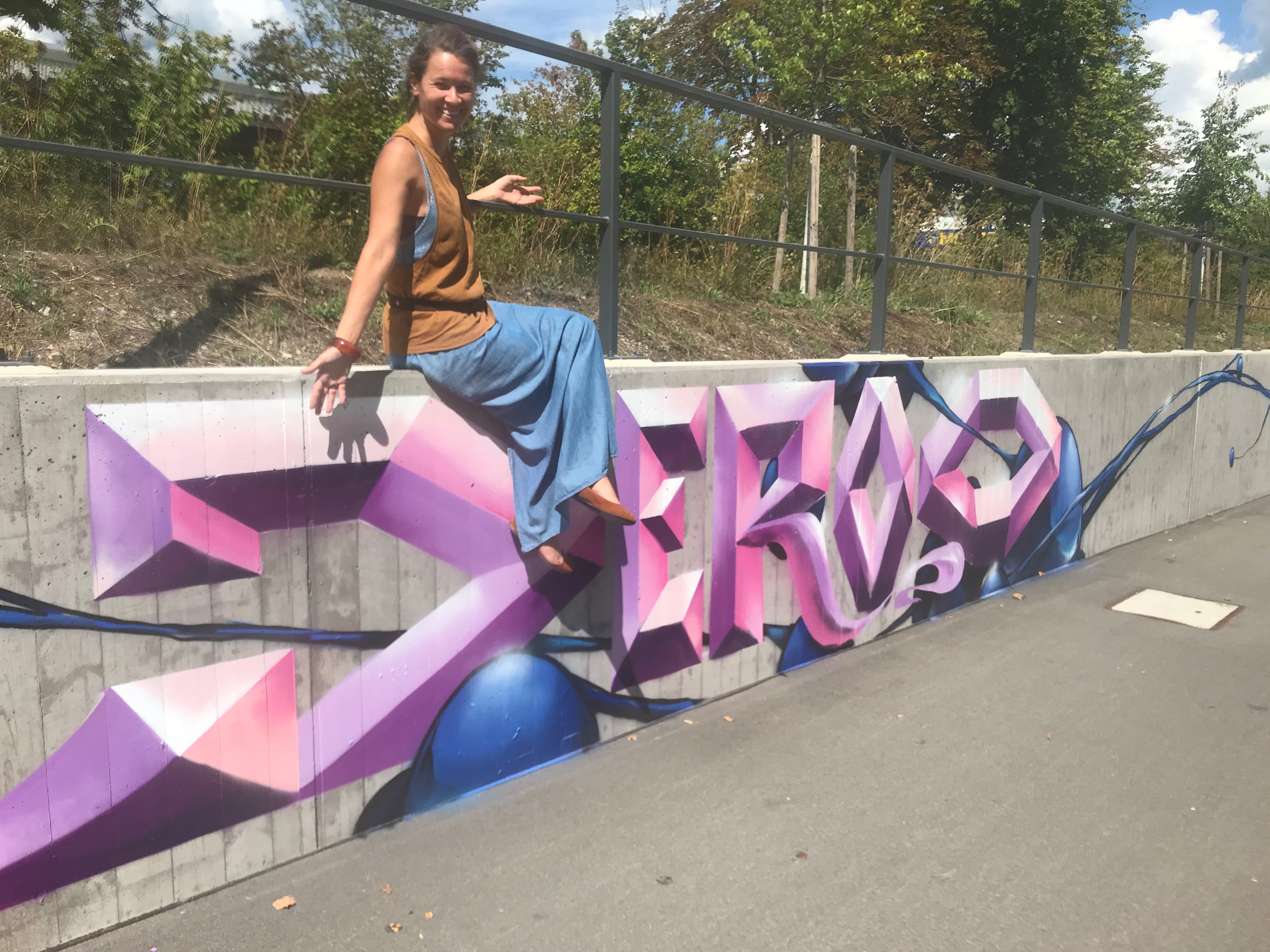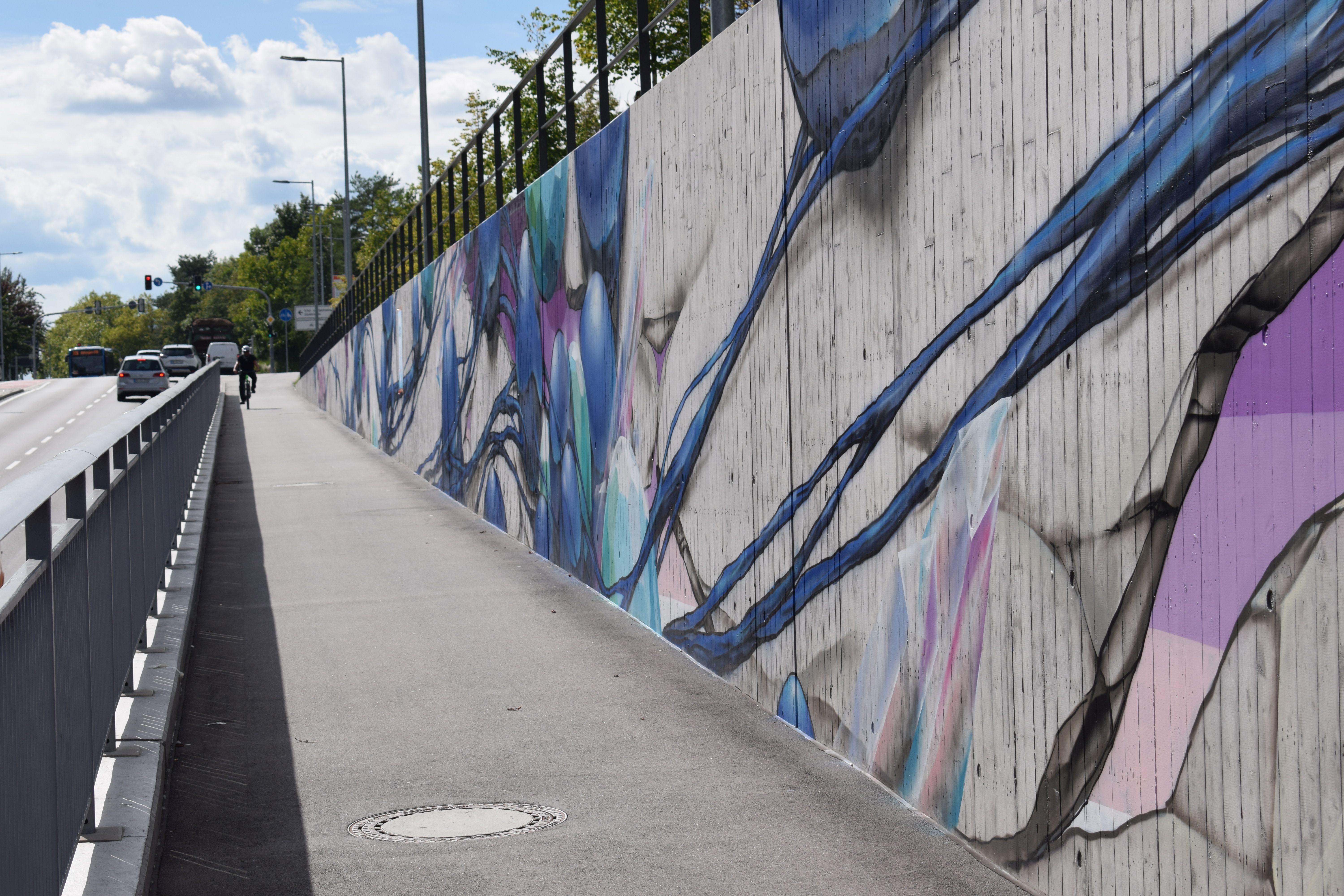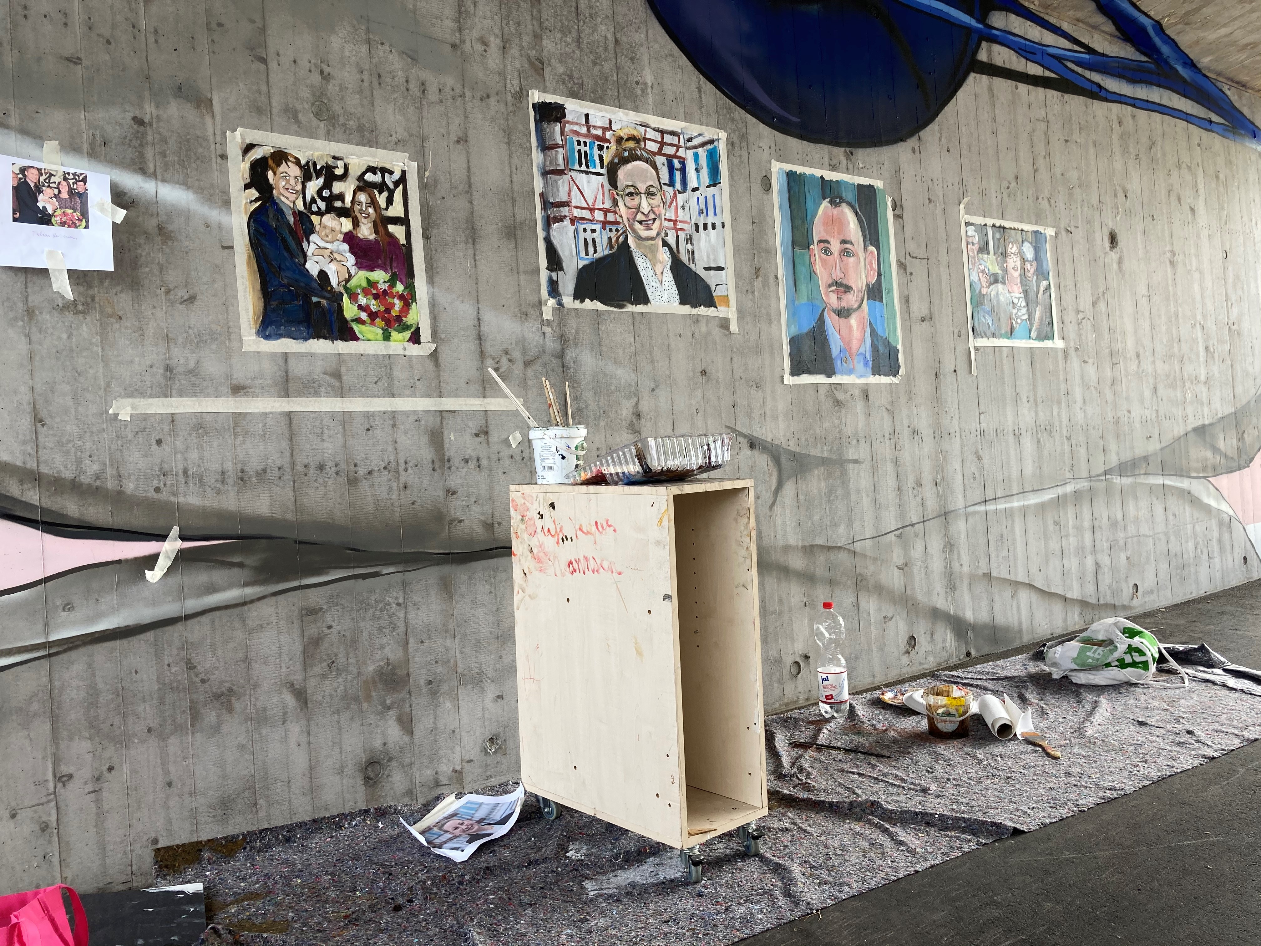 Von den in Berlin lebenden Wandmalenden Jim Avignon und Henrieke Ribbe ausgeführt, gehen die stilistisch überzeichneten und gleichzeitig lebensnah eingefangenen Antlitze in Art einer Gemäldegalerie in einen farben- und formenprächtigen Dialog mit den abstrahiert-verspielten, floral-kristallinen Bildfindungen des Stuttgarter Sprayers Jeroo, der für sein bisher größtes geschaffenes abstrakt-ornamentales Graffiti-Werk im Ausmaß von jeweils rund 230 Meter Länge pro Wand weit mehr als 300 Montana-Spraydosen verbraucht hat.