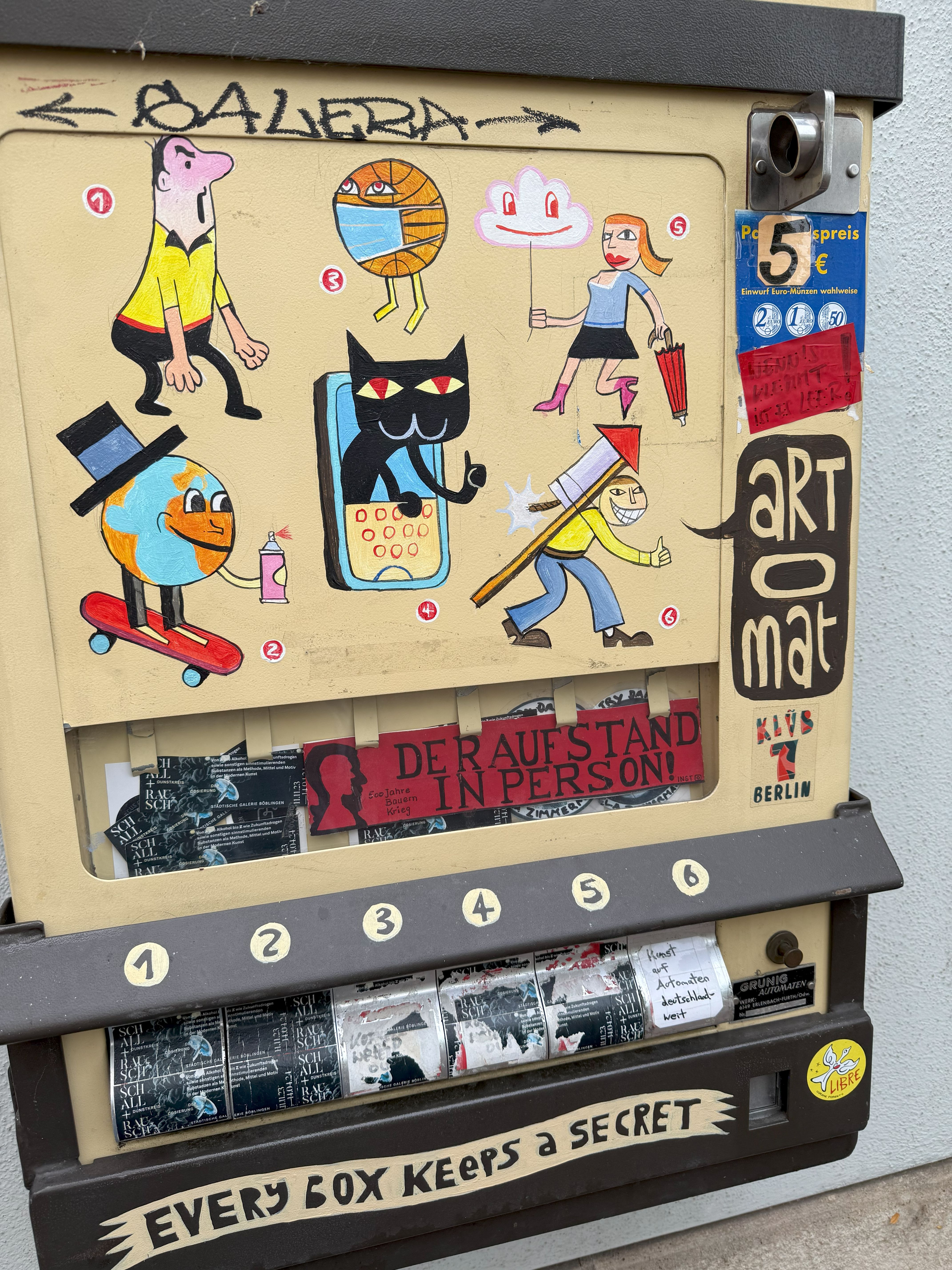 ABER AUFGEPASST: Die Kunstwerke sind streng limitiert! Kaum bis zum Rand befüllt, sind die bestückten Schachteln meist schon nach ein paar Stunden oder wenigen Tagen vergriffen: Denn was sich hier ziehen lässt, gibt es nur, solange der Vorrat reicht. Schnell sein lohnt sich – und am besten packen Sie genügend Münzgeld ein: Der Automat akzeptiert ausschließlich Münzen! Scheine oder Kartenzahlung sind nicht möglich.